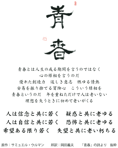 “青春とは人生の或る時期を言うのでなく、心の様相を言うのだ”の一文で始まる、サミュエル・ウルマン原作の『青春』の詩。